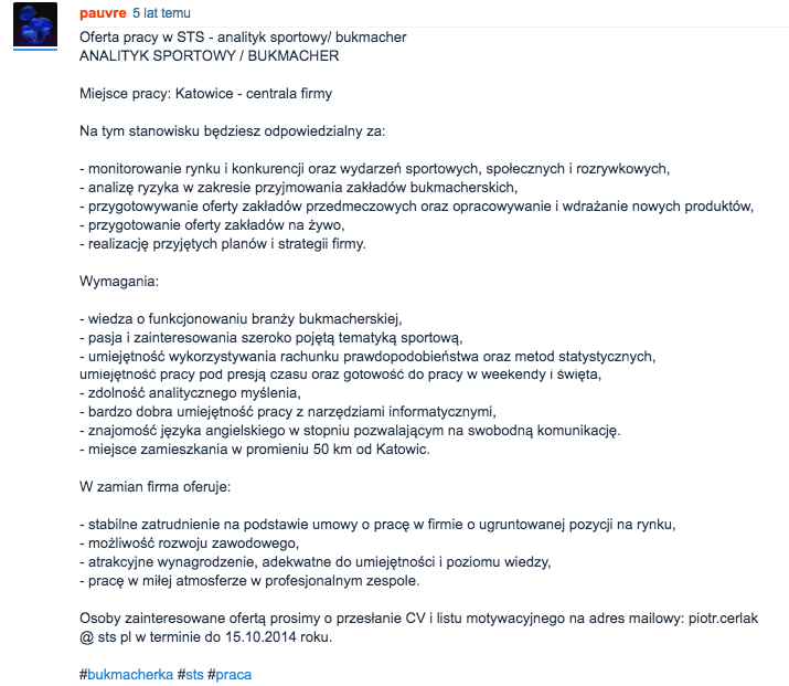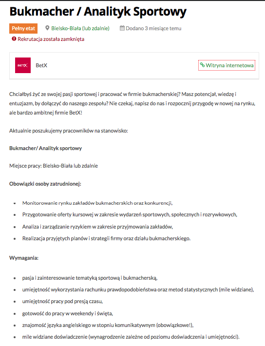 - Przykład: Oferta pracy dla analityka / https://www.wykop.pl/wpis/9743988/oferta-pracy-w-sts-analityk-sportowy-bukmacher-ana/
