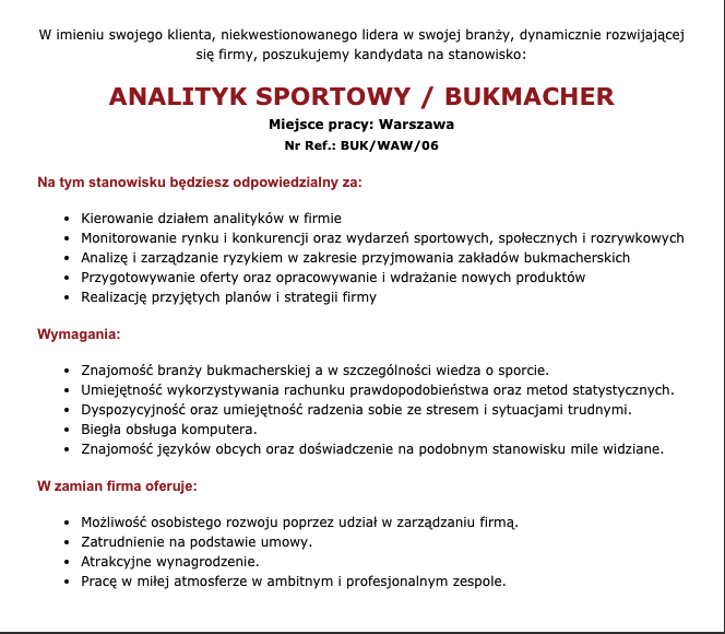 - Przykład https://pracasport.pl/praca/bukmacher-analityk-sportowy/