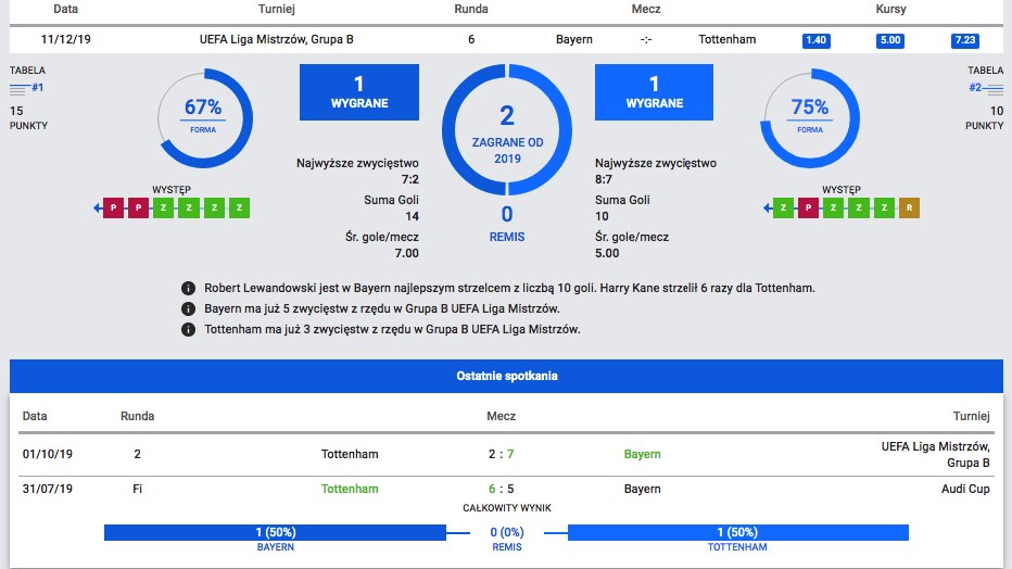 Bayern doskonale prezentuje się w tegorocznej edycji Ligi Mistrzów. W pięciu dotychczas rozegranych spotkaniach zebrali komplet 15 punktów, strzelili 21 bramek, a stracili ledwie 4. Formą bryluje zwłaszcza Robert Lewandowski ze swoimi rekordami, który zdobył już 10 bramek i jest najlepszym strzelcem bieżącej kampanii. W meczu z Tottenhamem powalczy o pobicie kolejnego rekordu – strzelając dwie bramki poprawi rekord liczby bramek strzelonych w fazie grupowej. A patrząc na kursy w Totalbecie, analitycy buka są niemal pewni, że coś ustrzeli i tym razem. Kurs na zdobycie bramki przez Lewego wynosi – 1.45. Drugi na liście bukmachera do strzelenia gola jest Gnabry – kurs 2.25. Wracając do rekordów, to dotychczasowy najlepszy wynik należy do Cristiano Ronaldo, który w sezonie 2015/16 zaliczył 11 trafień. W opinii bukmacherów to właśnie Bayern jest faworytem, kurs na zwycięstwo Mistrzów Niemiec wynosi w zakładach bukmacherskich Betclic 1.37.