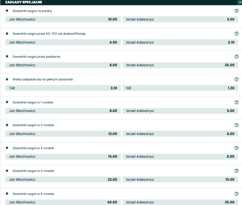 Na tydzień przed walką internetowi bukmacherzy poszerzyli ofertę rynków bukmacherskich na walkę Błachowicz vs Adesanya. Co można znaleźć w ich ofercie? Przykładowo w ofercie BETFAN można znaleźć takie zakłady specjalne jak poniżej: