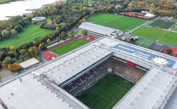 Merkur Spiel-Arena, będąca domem Fortuny Düsseldorf, która ostatni raz grała w 1. Bundeslidze w sezonie 2019/2020, została wybudowana w latach 2002-2004 na miejscu starego Rheinstadion – obiektu, na którym odbywały się mecze Mistrzostw Świata FIFA w 1974 roku i Euro ’88. Nowy stadion posiada rozsuwany dach i jest ogrzewany, co zapewnia temperaturę wewnętrzną sięgającą nawet 15°C w najzimniejsze dni. Na arenie tej odbywały się również mecze futbolu amerykańskiego, koncerty, walki bokserskie oraz mecze reprezentacji Niemiec.