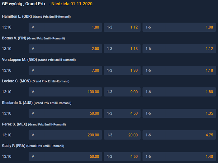 Kursy bukmacherskie na Grand Prix Emilii-Romanii 2020 (Imola)*: