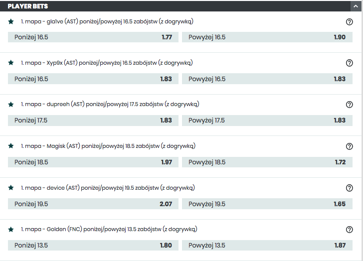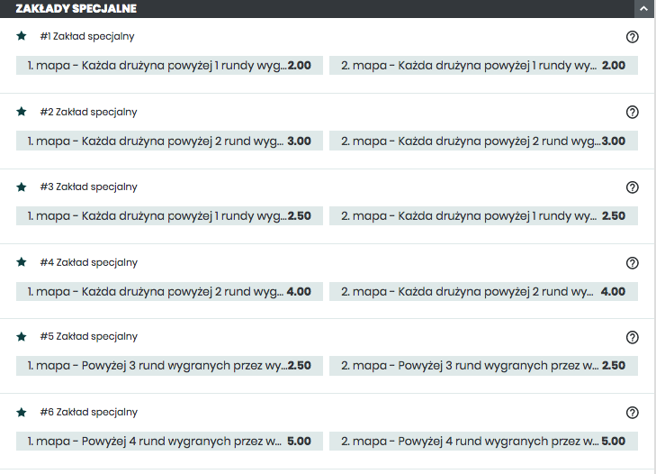 | Bukmacher | Zwycięzca meczu | Suma map | Suma rund | Zwycięzca z handicapem | Handicap rundowy | Będzie dogrywka? | Suma rund na mapę | Zwycięzca rundy pistoletowej | Liczba zabójstw zawodnika |