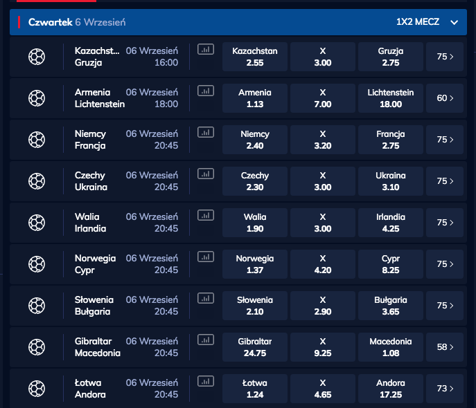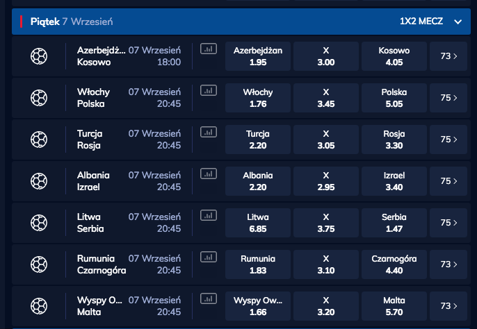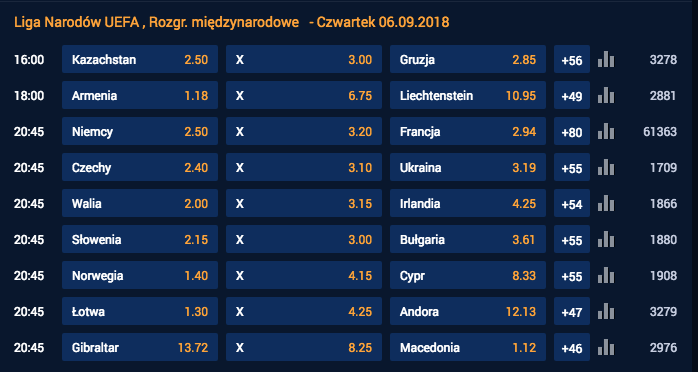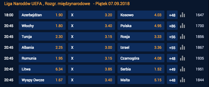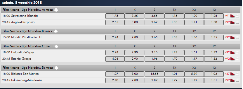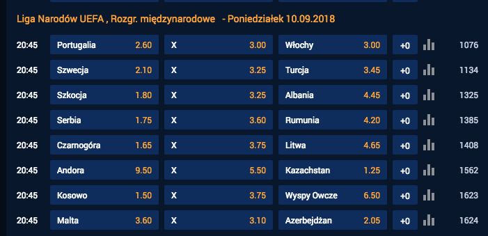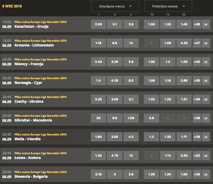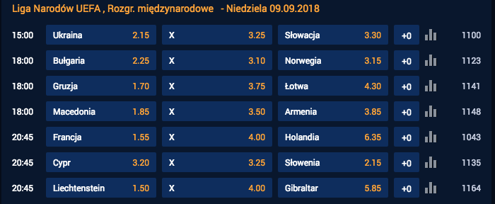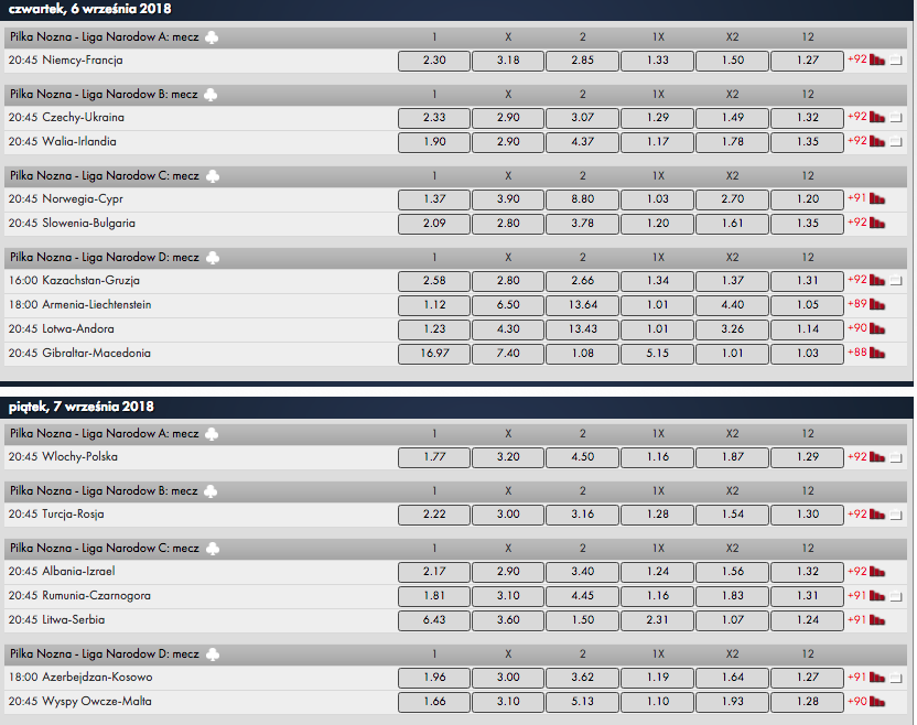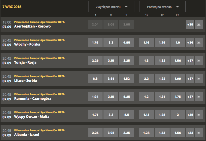 Co sponsor Zagłębia Lubin przygotował na Ligę Narodów UEFA? Podobnie jak u pozostałych legalnych bukmacherów standardem jest wystawienie oferty na 1 kolejkę. Natomiast ilości możliwości obstawiania poszczególnych meczów jest czymś co wybija się na tle innych buków. W przeważającej większości spotkań, są aż 92 różne opcje!