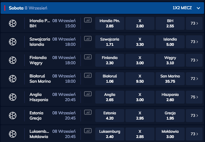 Lider na polskim rynku bukmacherskim, oprócz 1 kolejki, oferuje już swoje typy na większość meczów 2 kolejki. Przeciętnie można znaleźć około 47 możliwości obstawiania.