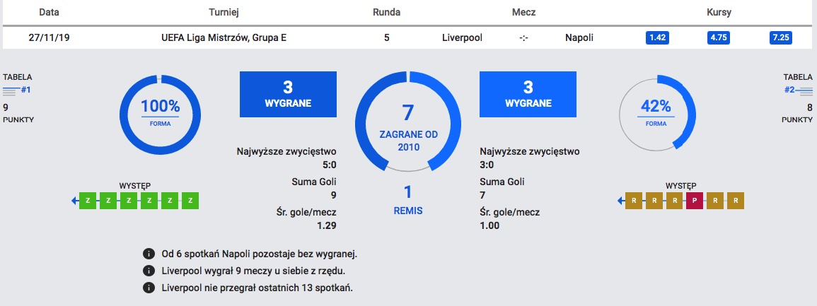 Bukmacherzy nie mają wątpliwości, kto jest faworytem środowego starcia. Analitycy bukmacherscy ETOTO wyżej cenią szanse drużyny gospodarzy, a kurs na zwycięstwo Liverpoolu wynosi 1.42. Obrońcy tytułu rozgrywają kapitalny sezon, w którym seryjnie wygrywają spotkania. Na wszystkich frontach rozegrali łącznie 22 mecze, z których wygrali aż 19. Jedną z nielicznych porażek doznali właśnie z drużyną z Neapolu. W pierwszym spotkaniu między tymi zespołami padł wynik 2:0 dla Napoli.