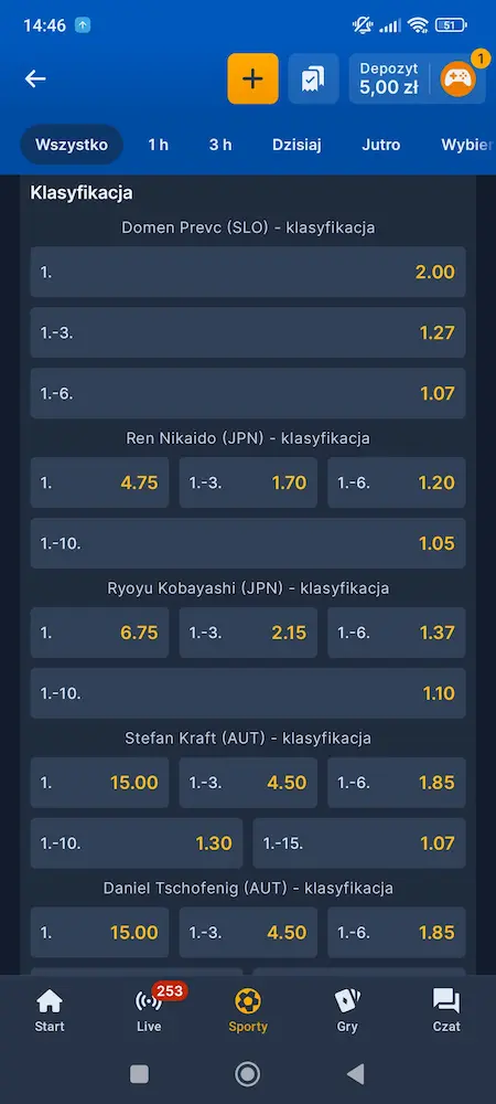 Szczególnie dobrze wypadają rynki powiązane z długością skoku i aktualną pozycją zawodnika. To selekcje, które naturalnie pasują do charakteru skoków i pozwalają obstawiać nie tylko kto wygra, ale jak przebiegnie sam konkurs.