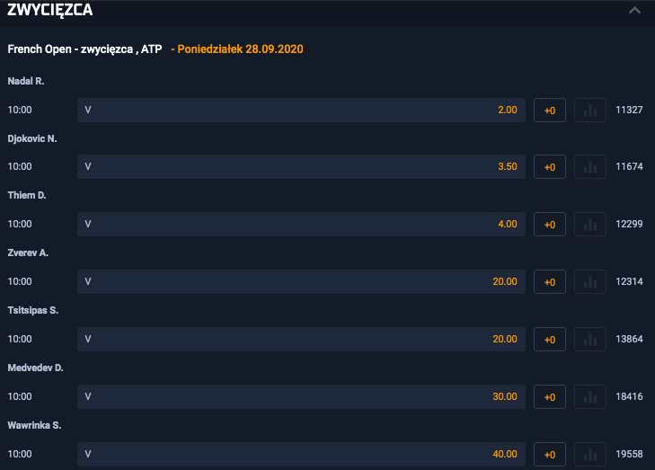 W dwóch ostatnich finałach na kortach im. Rolanda Garrosa wyższość Nadala uznawał Dominic Thiem. Dodatkowo kilkanaście dni temu Austriak świętował w Nowym Jorku swój pierwszy wielkoszlemowy tytuł (US Open), dzięki czemu wśród faworytów French Open 2020 plasuje się na trzecim miejscu z niewysokim kursem 4.00. Kolejne miejsca na liście STS zajmują natomiast: Alexander Zverev (20.00), Stefanos Tsitsipas (20.00) i Daniił Miedwiediew (30.00), ale zwycięstwo w stolicy Francji któregoś z nich należy rozpatrywać raczej jako niespodziankę.