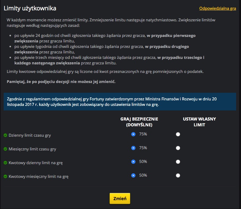 Zapisy ustawy hazardowej zobowiązują zakłady bukmacherskie do propagowania wśród graczy tak zwanej odpowiedzialnej gry. Powinny one udostępnić swoim klientom m.in. narzędzia pozwalające na ustawienie limitów czasowych na grę, wyznaczenie maksymalnej kwoty jaką wydają na obstawianie meczów oraz możliwość samowykluczenia się z gry i zawieszenia zawierania zakładów. Rozporządzenie zobowiązuje również właścicieli zakładów do umieszczenia na stronie informacji o zasadach odpowiedzialnego typowania.
