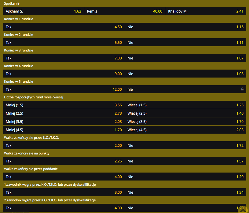 Wracając do walki wieczoru, to czas na odpowiedź na pytanie: kto jest faworytem bukmacherów do wygrania walki Askham a Khalidov? Analitycy bukmacherscy w roli zwycięzcy widzą, niepokonanego do tej pory w KSW Brytyjczyka.